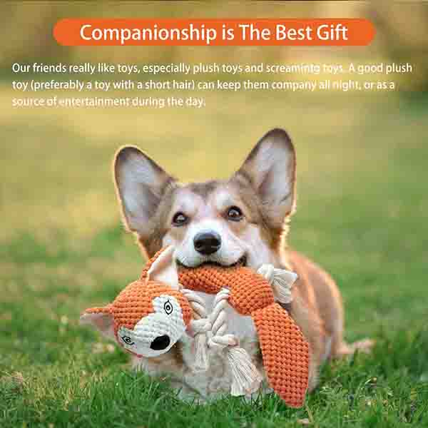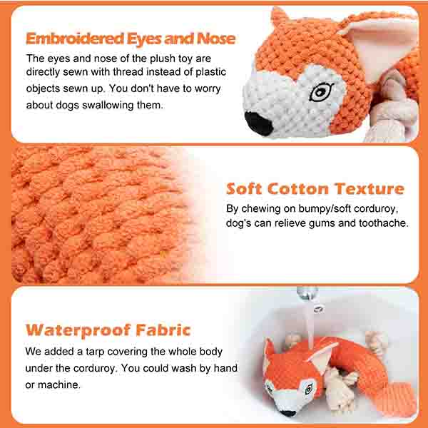Four Rope Knots and A Squeaker: This Fox Shape Plush Dog Toy come with 4 rope knots and a Squeaker, which are the temptations that dogs can't resist.